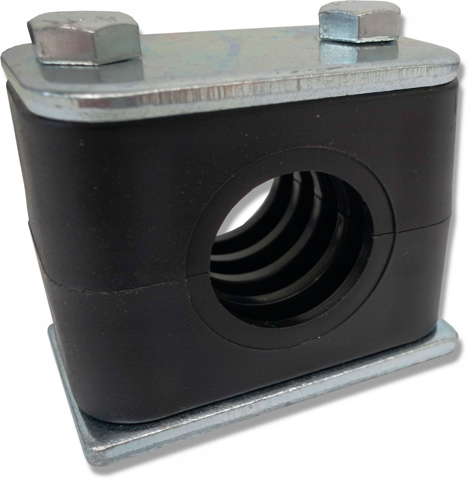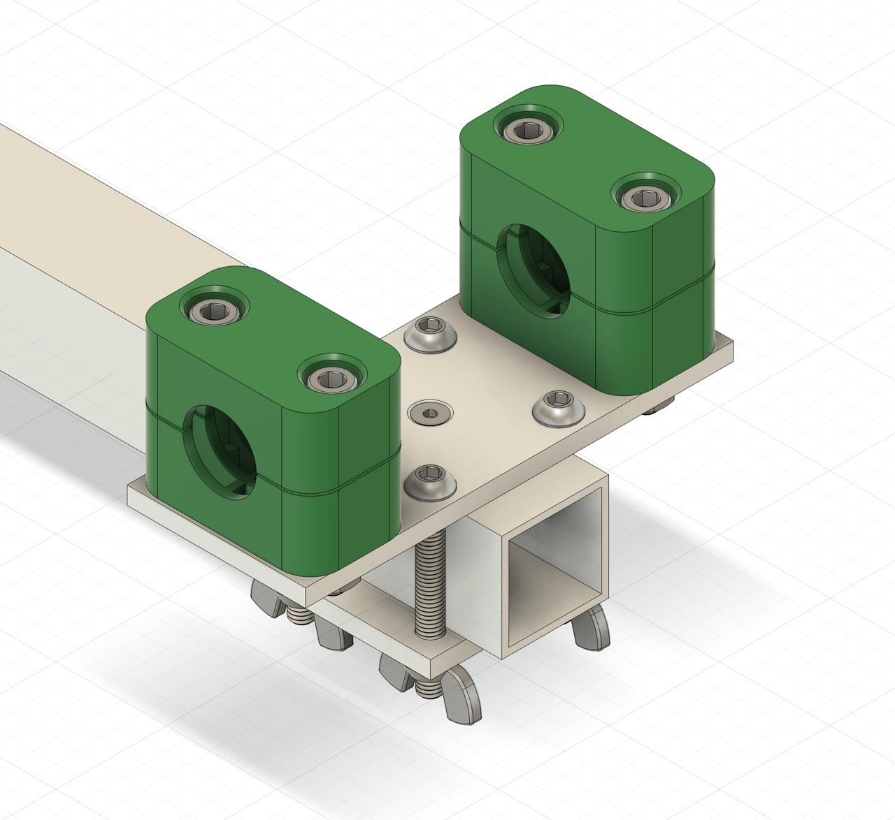 Mocowanie wibratora wykonane jest w analogiczny sposób. Tym razem jednak płytka montażowa ma długość 300mm, a po każdej jej stronie zamocowane są po dwie obejmy hydrauliczne. Każda para obejm służy do zamocowania jednego ramiona dipola. Aby wzmocnić środek dipola, wytoczono z wałka z tworzywa sztucznego (POM-C) o średnicy 20 mm łącznik, który wchodzi do środka ramion dipola i zapewnia stały odstęp między nimi.
