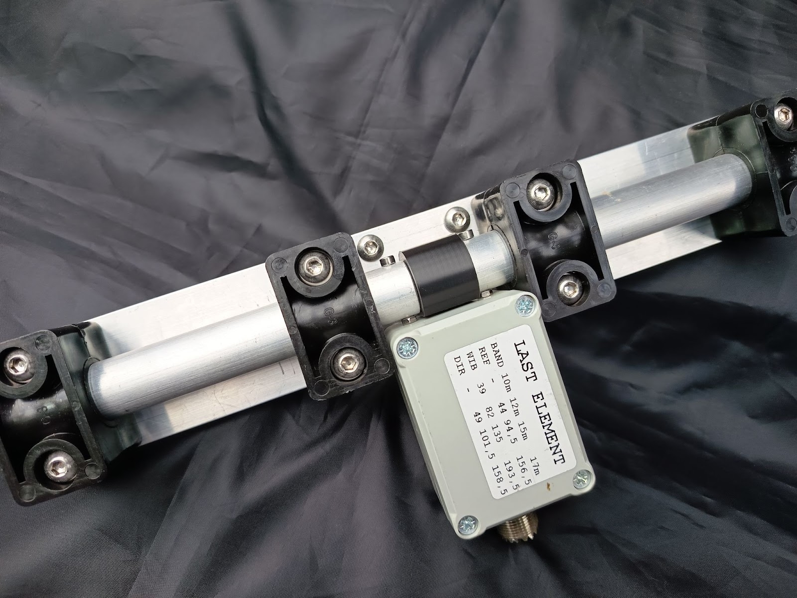 Elementy anteny wykonano z rurek aluminiowych 20 x 1,5, 16 x 1,5 i 12 x 1, zgodnie z oryginalnymi zaleceniami autora projektu. Tak dobrane średnice zapewniają, że rurki swobodnie wsuwają się jedna w drugą, lecz nie pozostaje pomiędzy nimi nadmierny luz. Na końcach rurek wykonano podłużna nacięcia umożliwiające ich zaciskanie. Jako zacisków użyto obejm GBS. Istotne jest, by zastosować obejmy nierdzewne, gdyż te wydają się być znacznie trwalsze. Do łbów śrub zaciskowych w obejmach przyspawano na sztorc nakrętki. Jest to tani i szybki, acz nieortodoksyjny, sposób zapewnienia beznarzędziowego montażu. Rurki o średnicy 16mm wpuszczone są w rurki o średnicy 20 mm na długość 20 cm. Długość wystającej części rurek 12mm jest regulowana i zależy od pasma, na którym antena ma pracować.