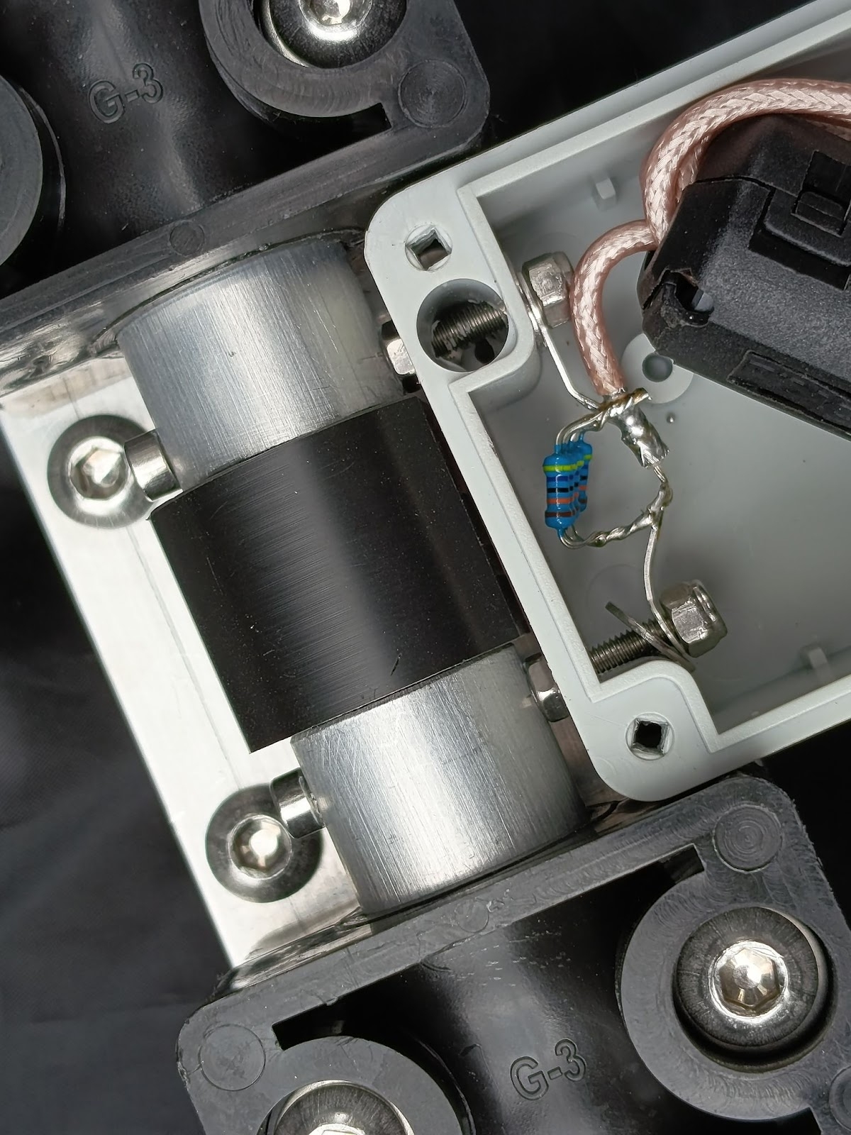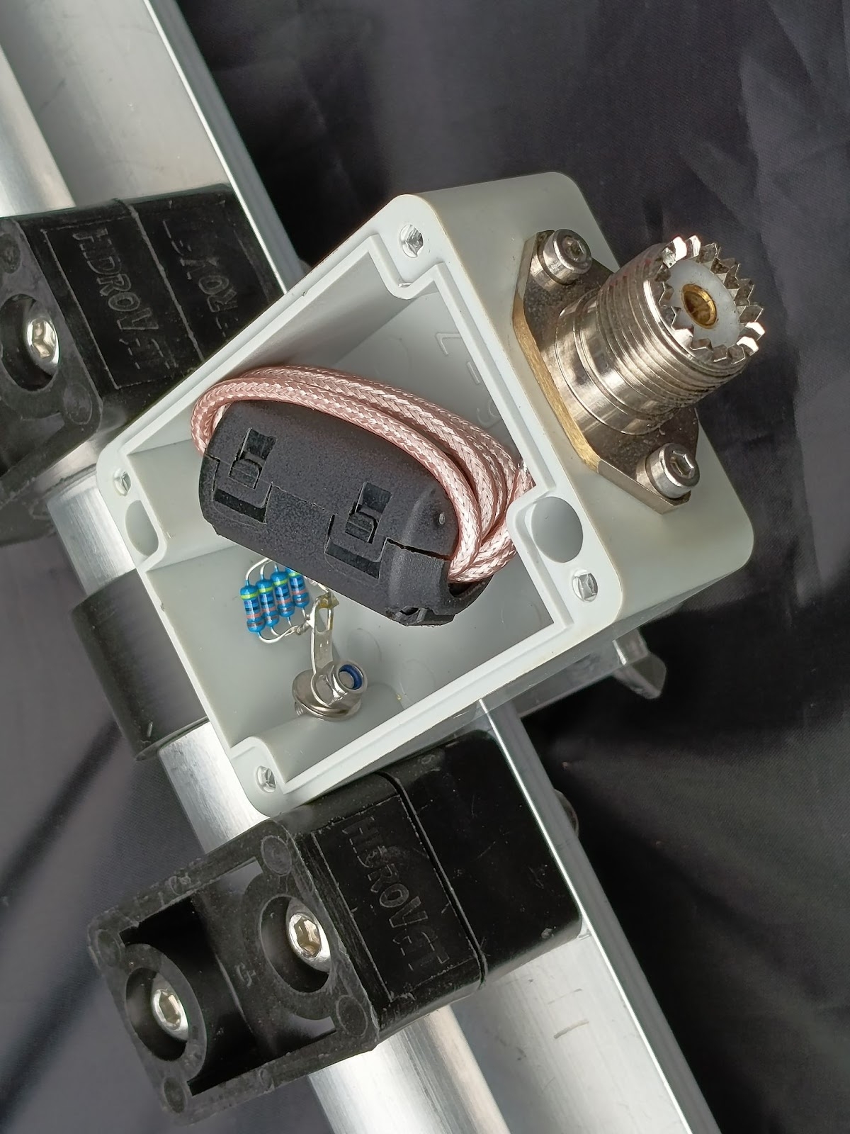 Zasilanie anteny zrealizowane jest poprzez choke balun składający się z chińskiego koralika EMI oraz 6 zwojów kabla RG316. Aby zmniejszyć szumy pochodzące z elektrostatyki, równolegle do ramion wibratora przylutowane zostały cztery rezystory połączone równolegle, o wynikowej rezystancji 120kΩ. Całość umieszczona jest w plastikowej puszce 70x50x40 mm, na której jednej ściance zamontowano gniazdo UC1, a na przeciwległej dwie nierdzewne śruby montażowe, przykręcone bezpośrednio do metalowych elementów ramion wibratora, będące jednocześnie zasilaniem tegoż.