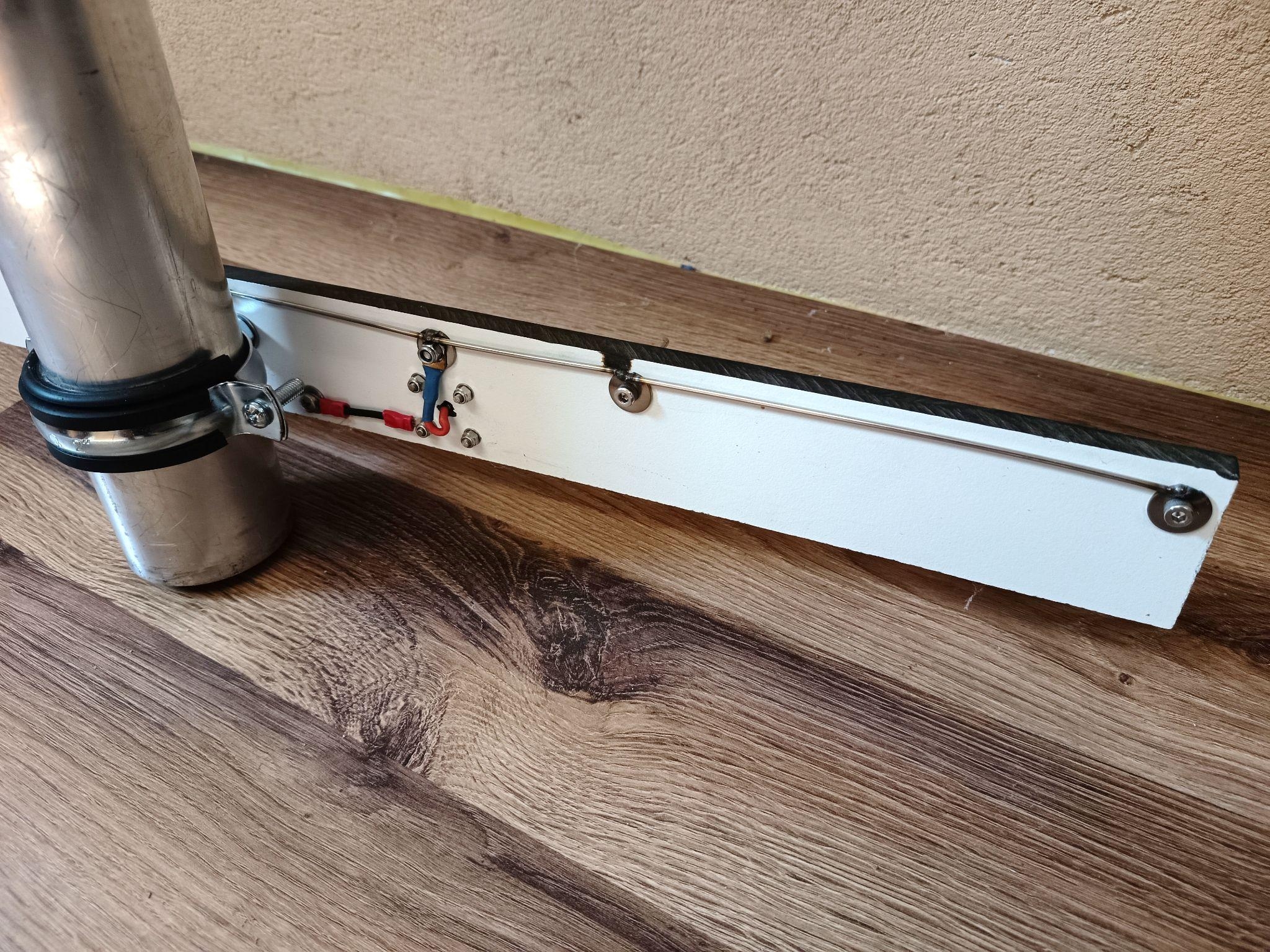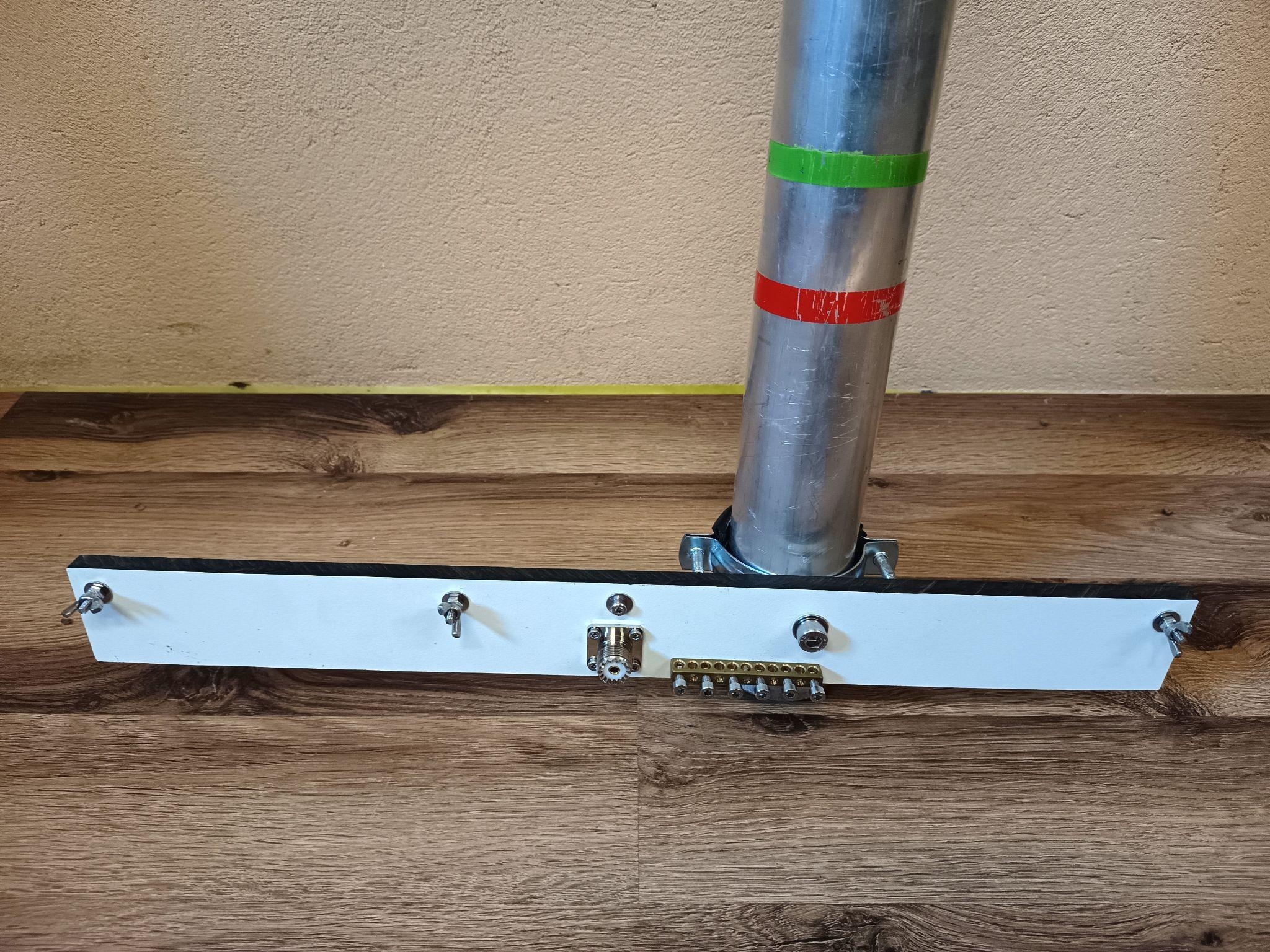 Poprzeczki Górna i dolna są wykonane z płyty HPL, ale można je wykonać z dowolnego trwałego i izolującego materiału. Środkowa poprzeczka jest jedynie wyciętym z 3mm płyty PMMA dystansem utrzymującym linki w stałej odległości od masztu. Dolna poprzeczka jest przymocowana do masztu obejma rurową, która jednocześnie przenosi zasilanie na maszt.